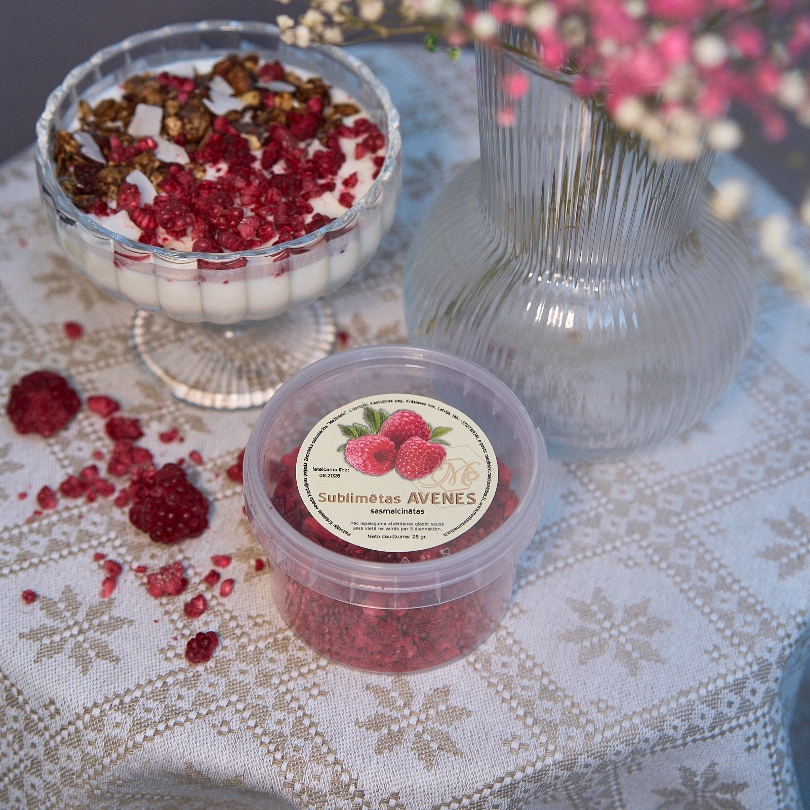 Liofilizētas avenes, pašaudzētas saimniecībā. Liofilizācijas (sublimācijas) procesā ogas saglabā savu garšu, vitamīnus un mikroelementus. Sublimētiem produktiem ir ļoti liels derīguma termiņš.