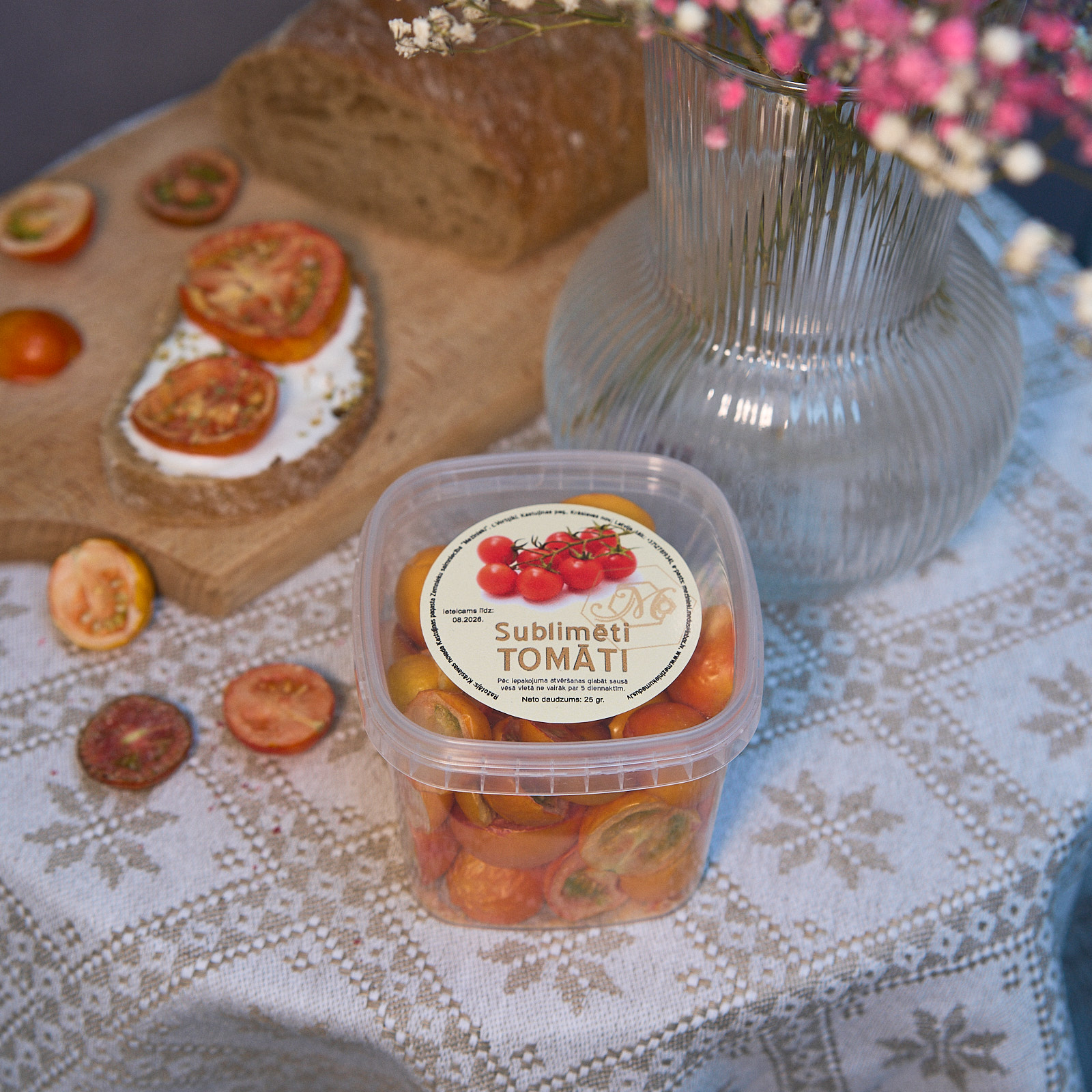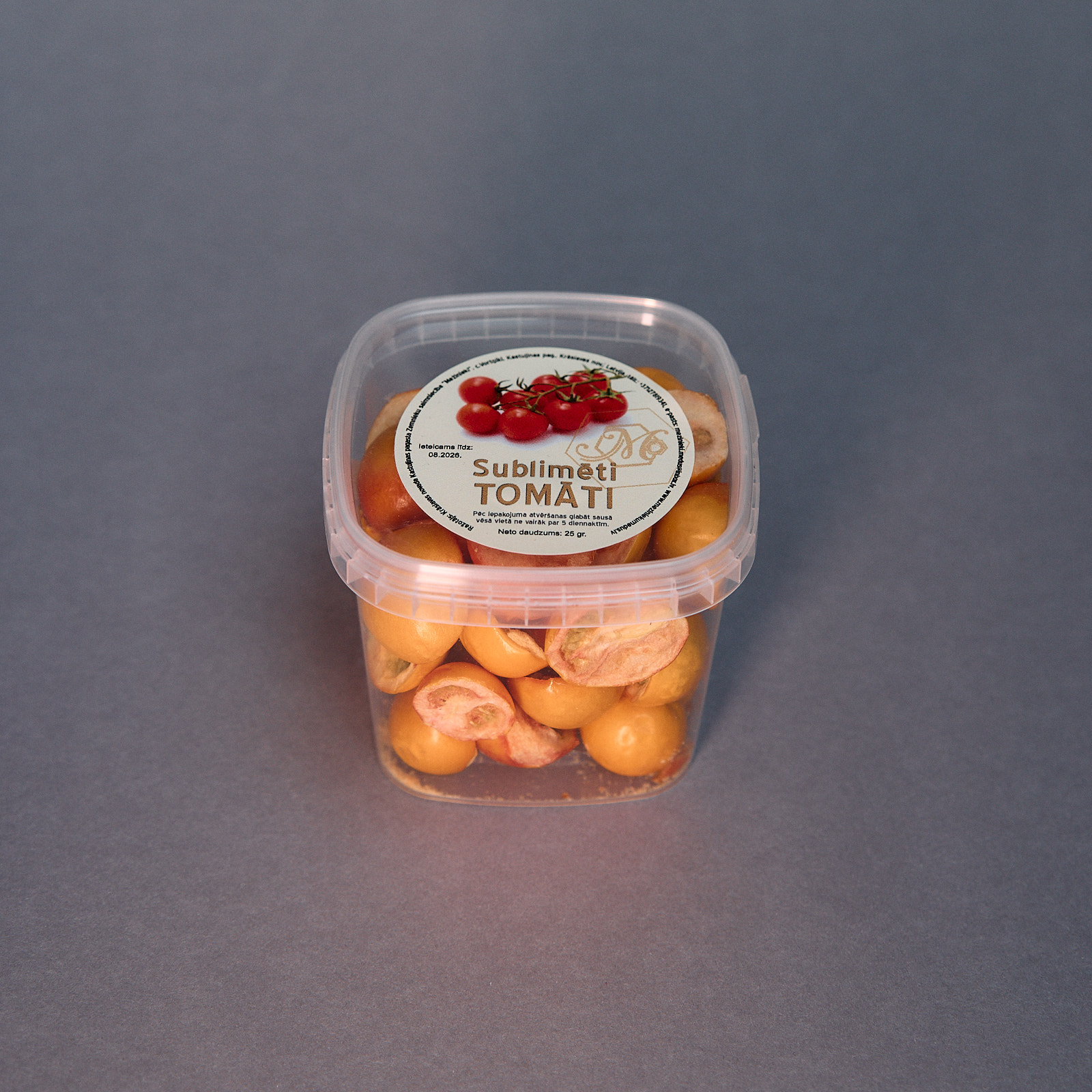 Liofilizēti tomāti. Liofilizācijas (sublimācijas) procesā dārzeņi saglabā savu garšu, vitamīnus un mikroelementus. Sublimētiem produktiem ir ļoti liels derīguma termiņš.